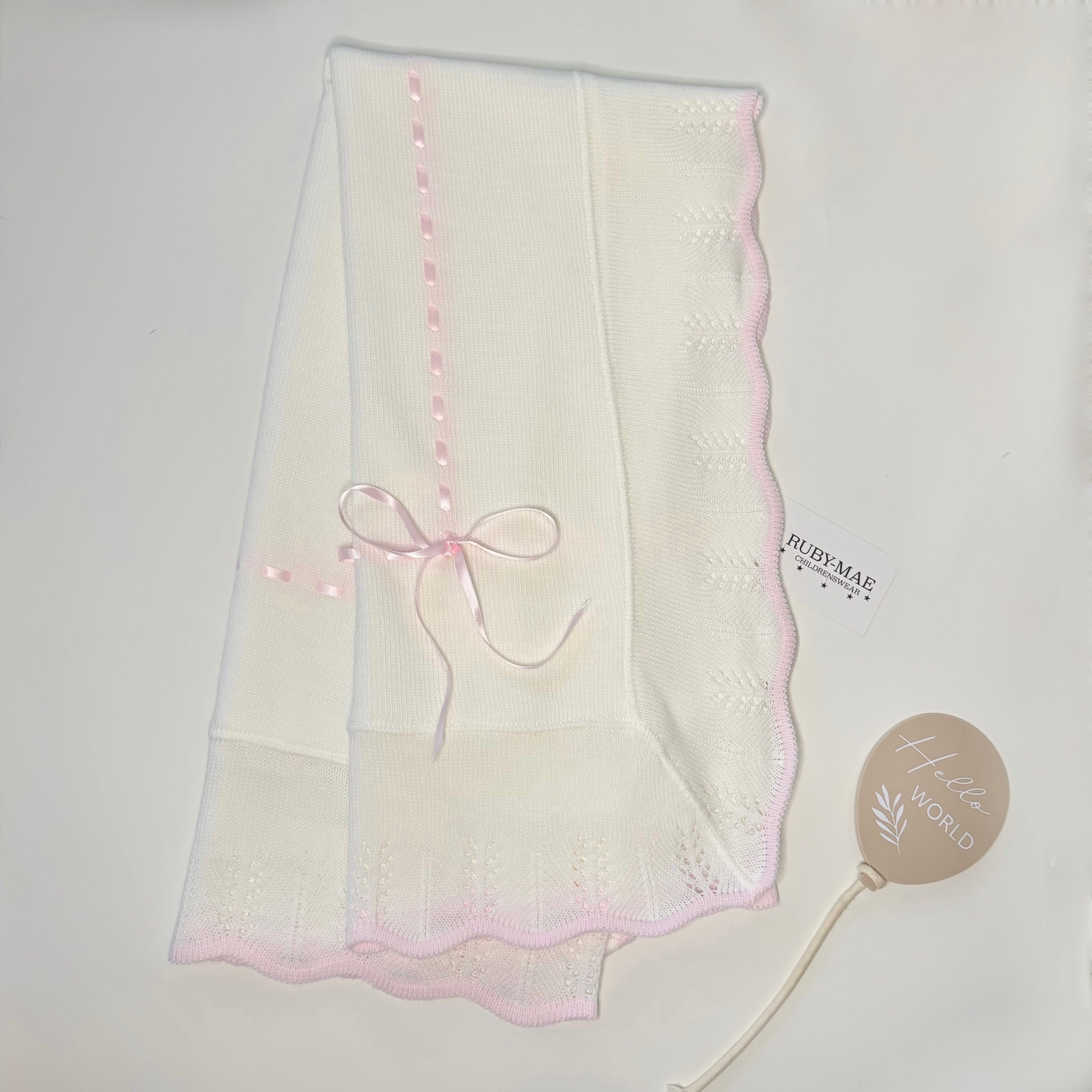 White With Pink Bow Knitted Baby Blanket