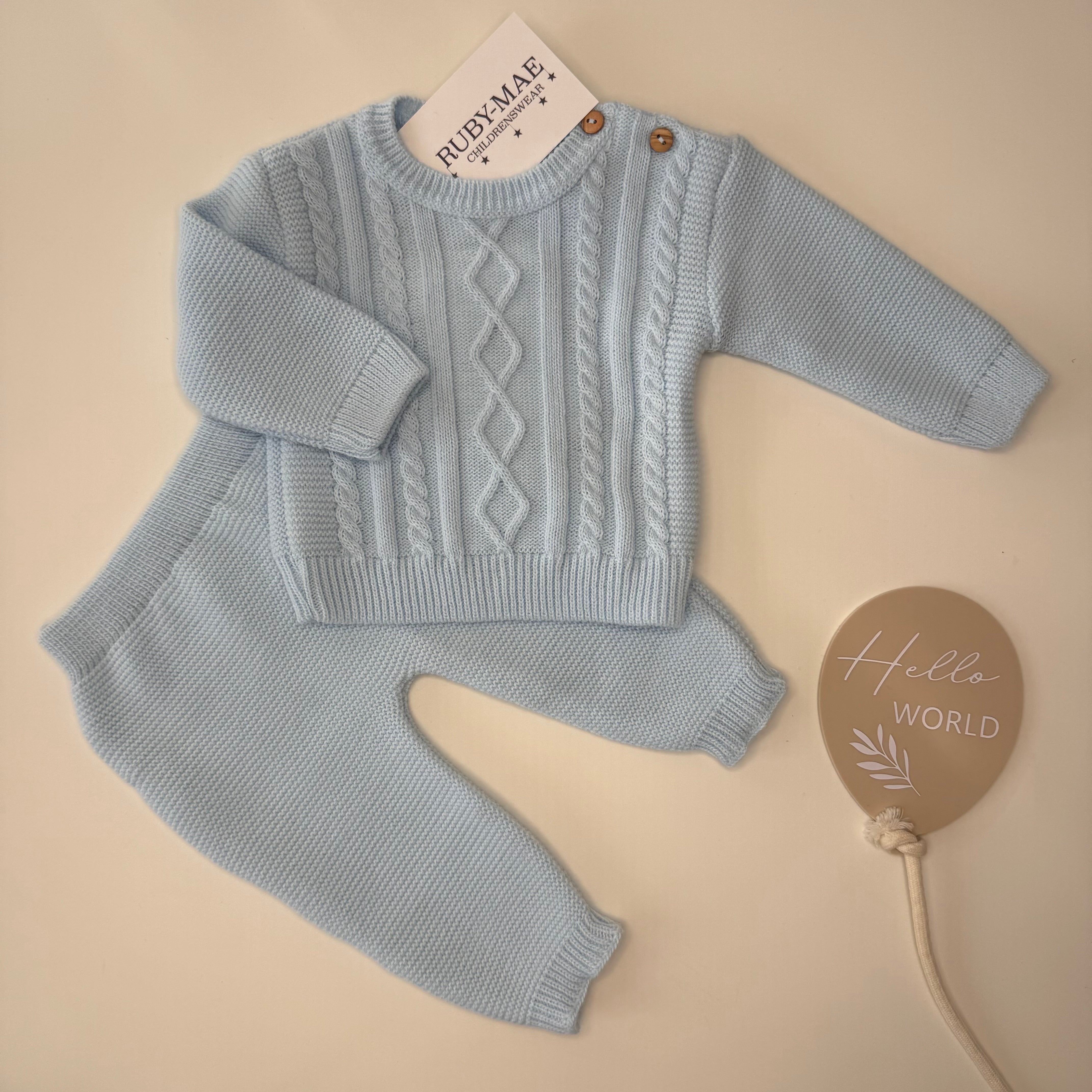 Baby Blue Knitted Jumper & Pants Outfit With Matching Hat - Jake