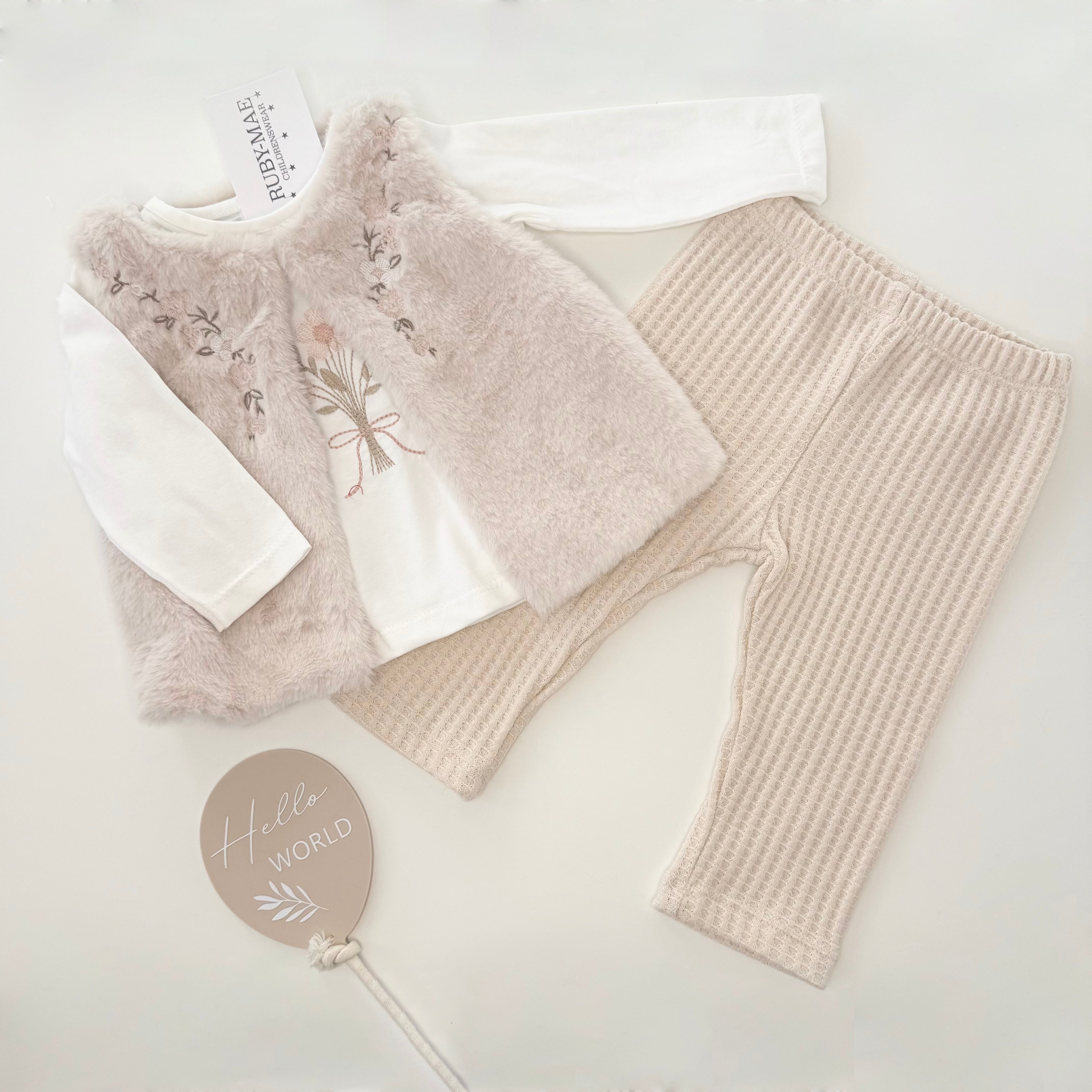 Beige Faux Fur Gillet With Matching Jumper & Pants 3 Piece Outfit - Victoria