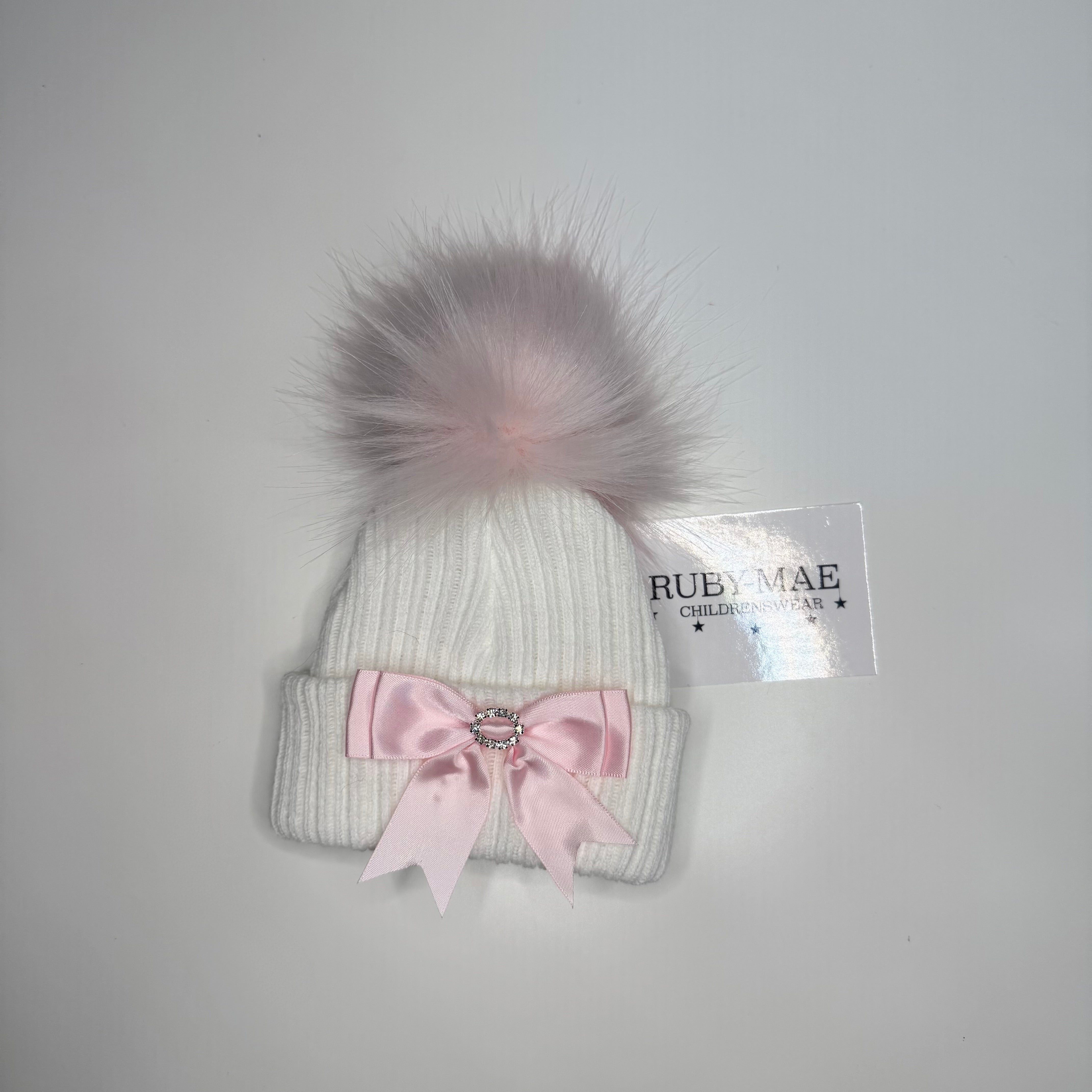 White Bow Front Pom Pom Hat