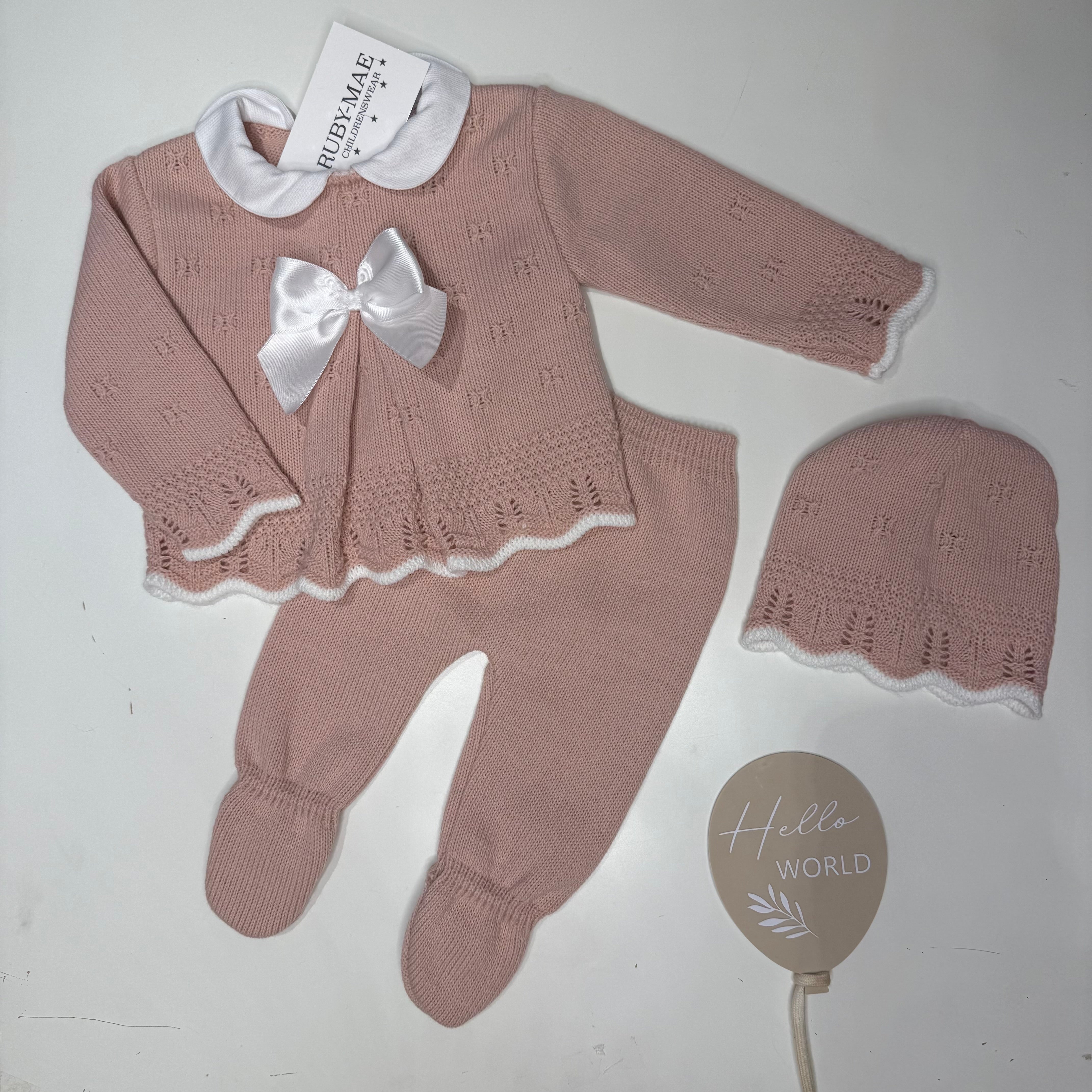 Dusky Pink With White Knitted Bow Jumper & Pants Outfit With Matching Hat - Hattie