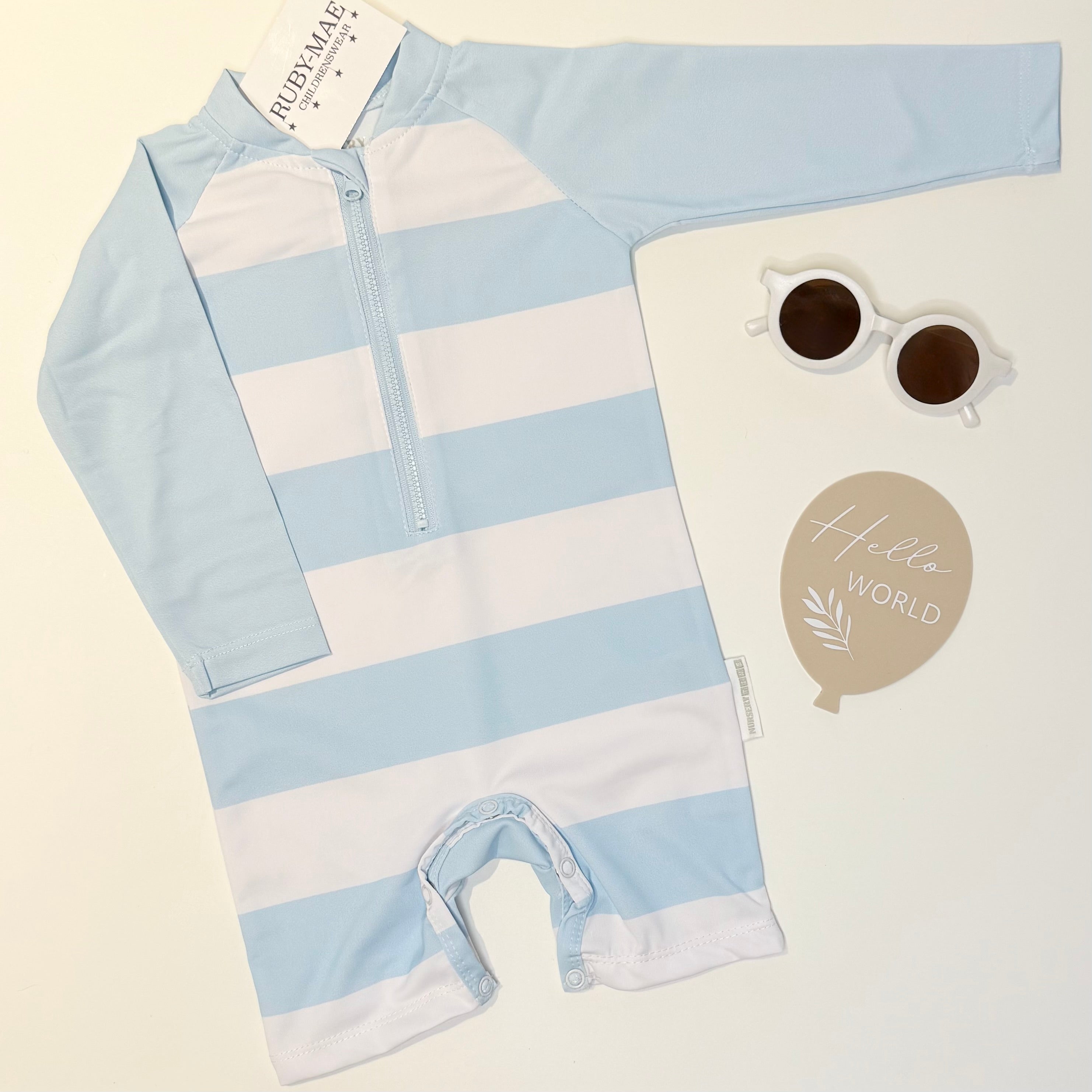 Boys Blue Stripe Long Sleeve Zip Swimsuit With Matching Sunglasses