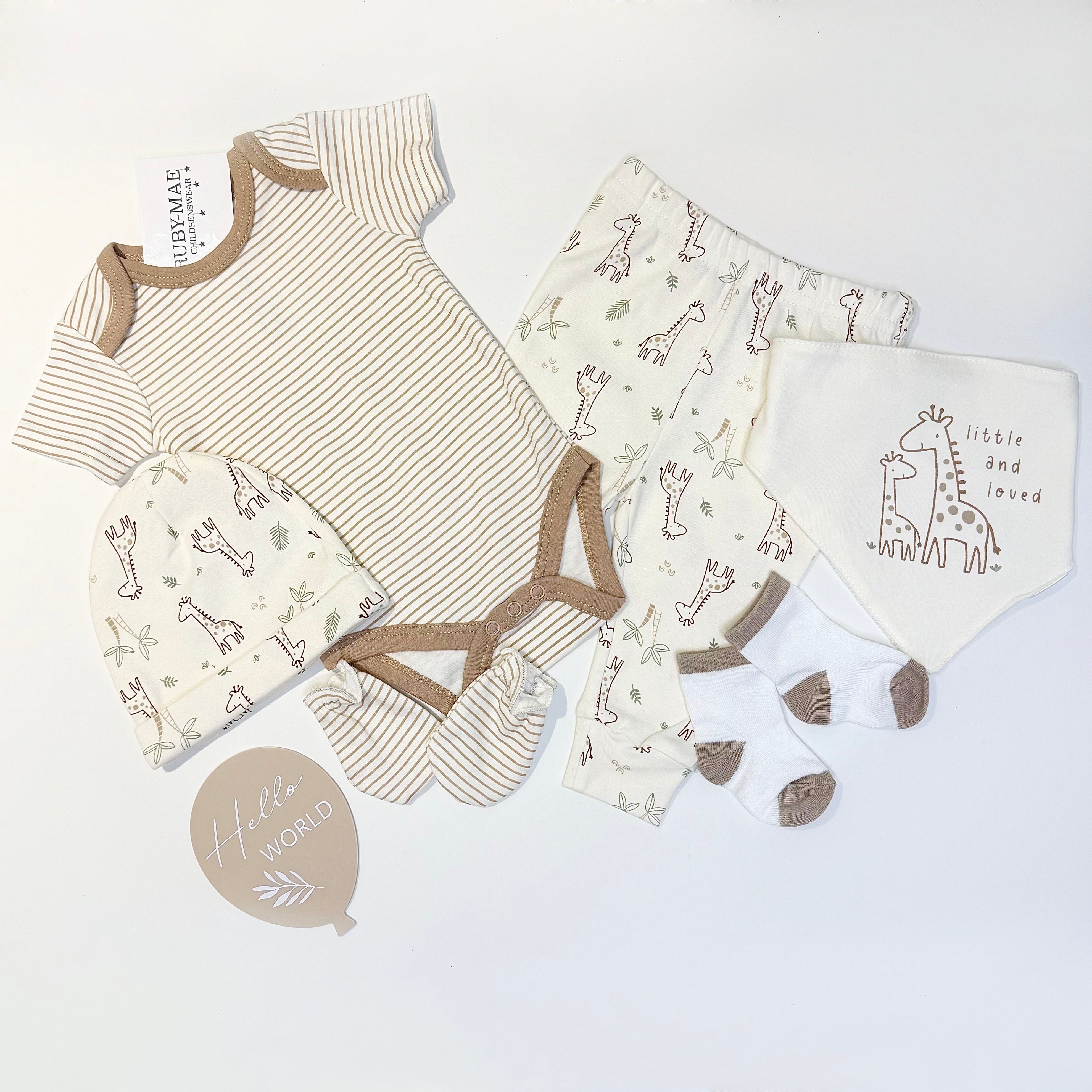 Brown Giraffe 6 Pack Pants, Vest, Bib, Socks, Mittens & Hat Gift Set