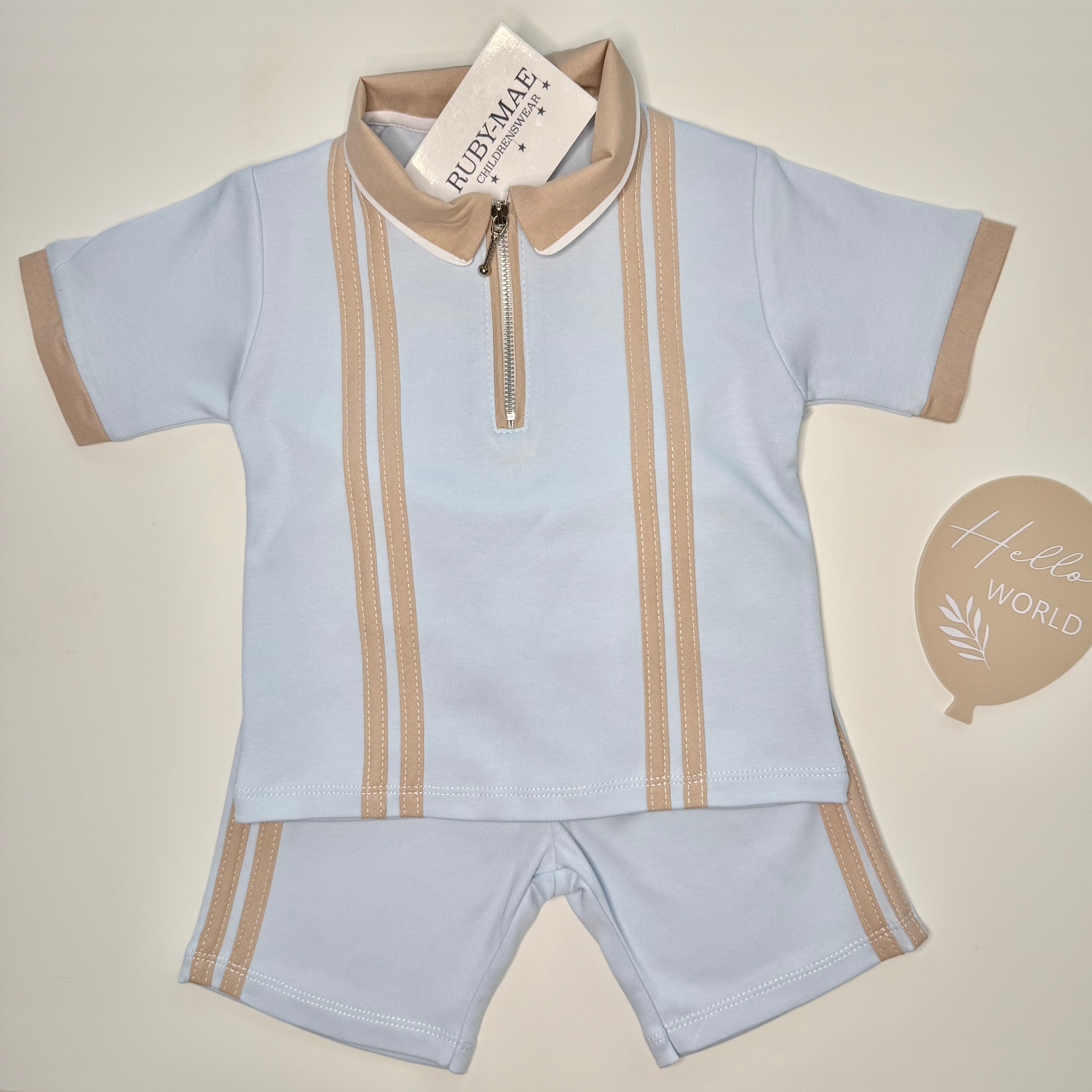 Blue And Camel Stripe Zip T-Shirt & Shorts Outfit - Zachary