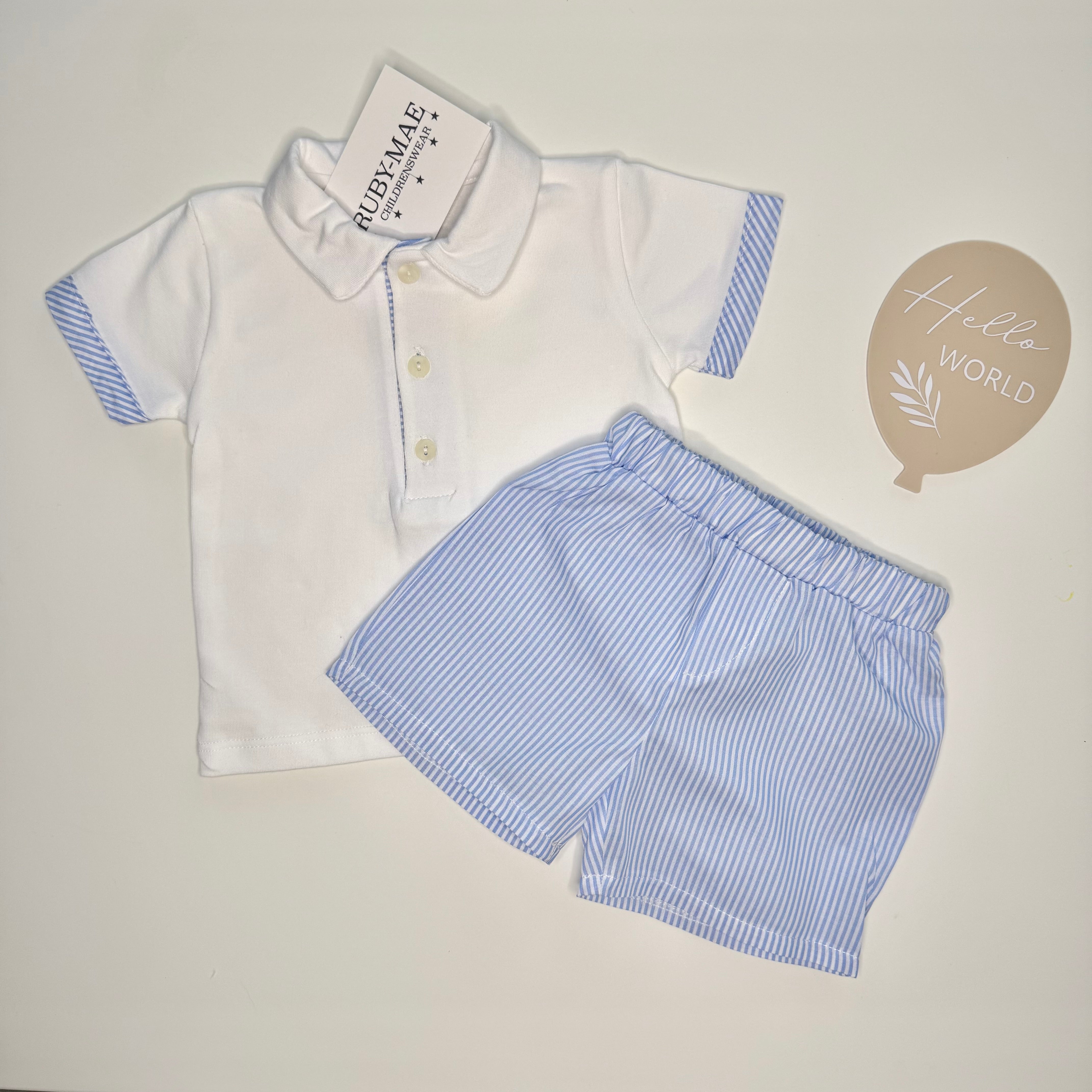 Blue And White Stripe Polo T-Shirt & Shorts Outfit - Oliver