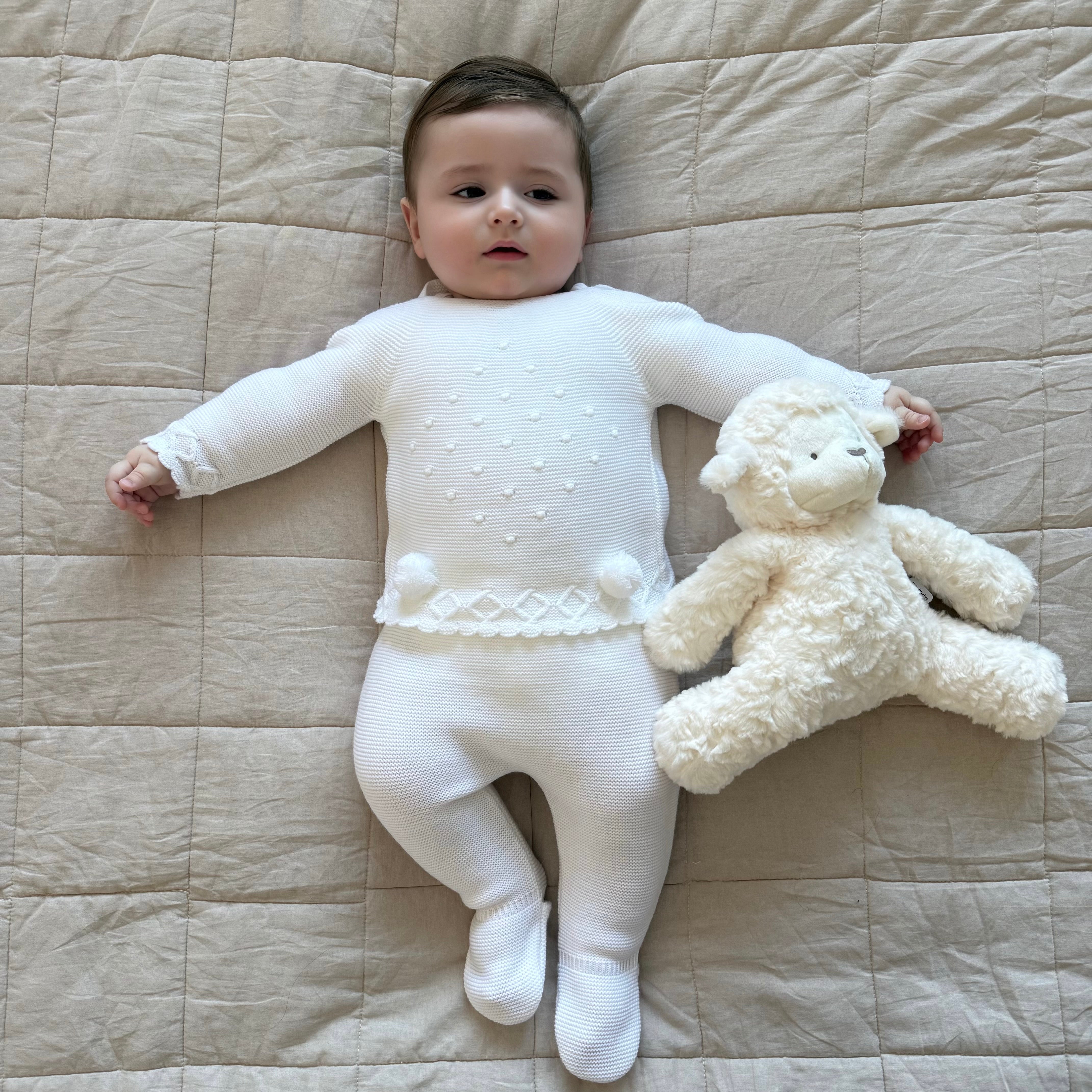 White Pom Pom Knitted Jumper And Pants Outfit With Matching Hat - UNISEX