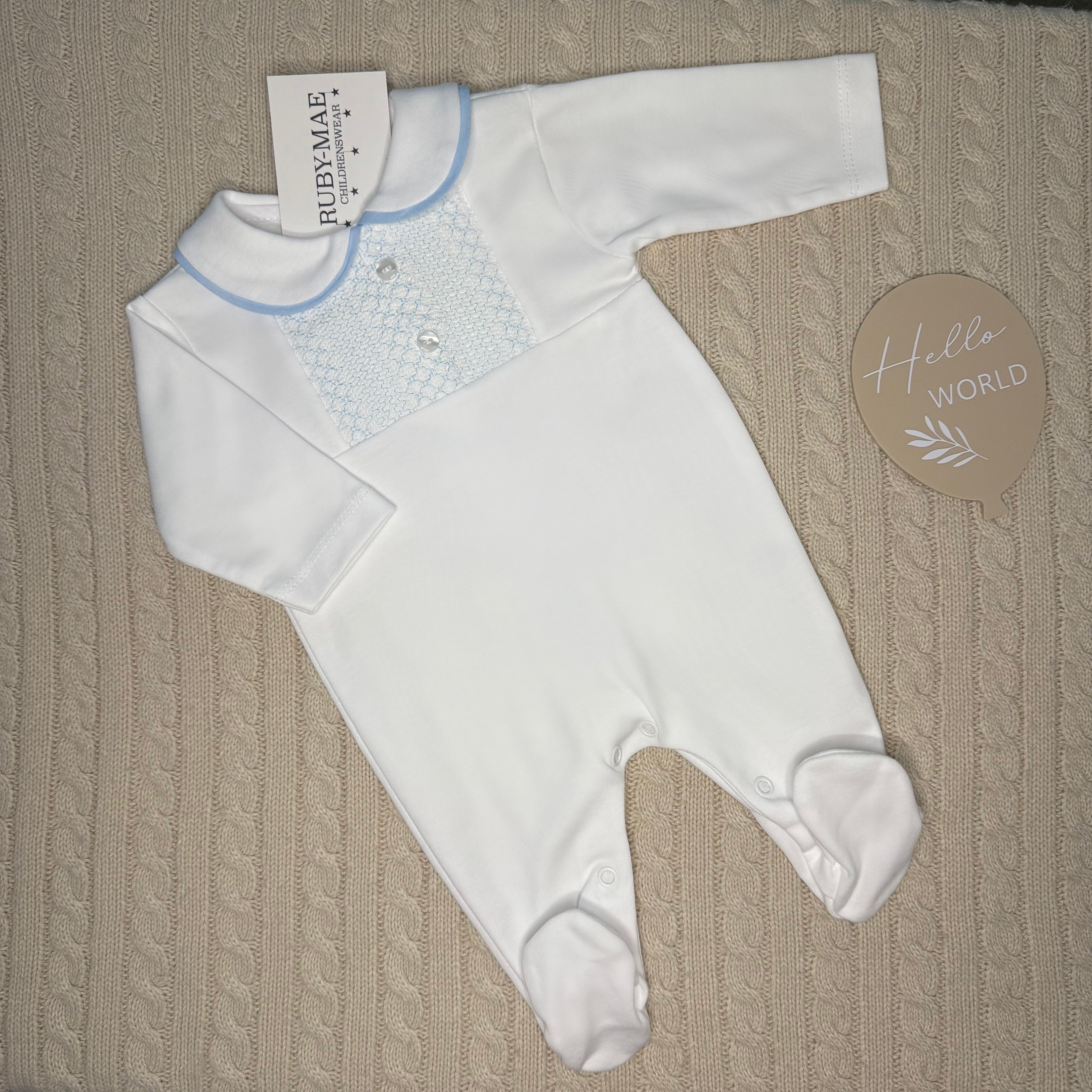 White With Blue Smock Cotton All In One Babygrow
