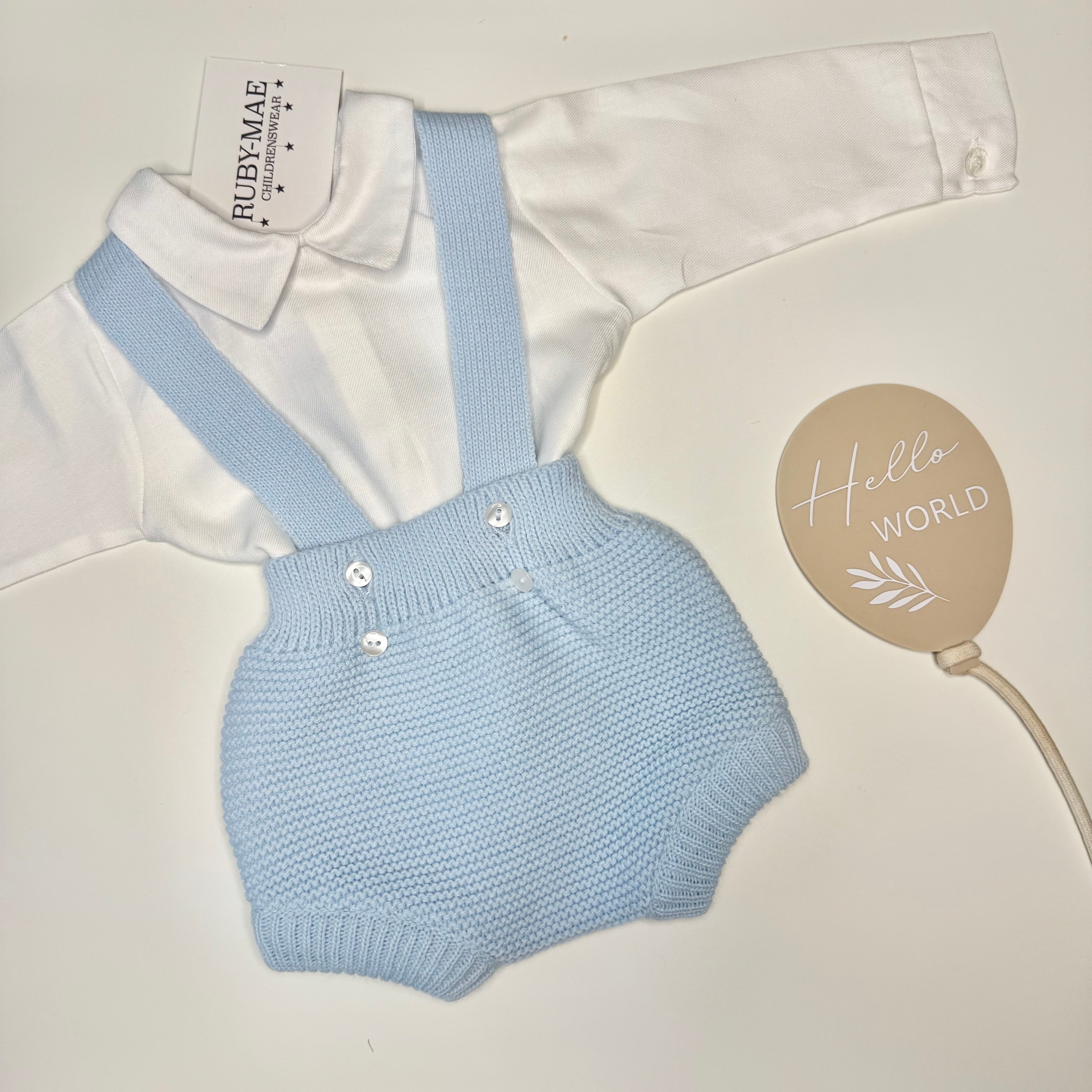 Blue Knitted Dungaree Romper With Matching Shirt - Oscar