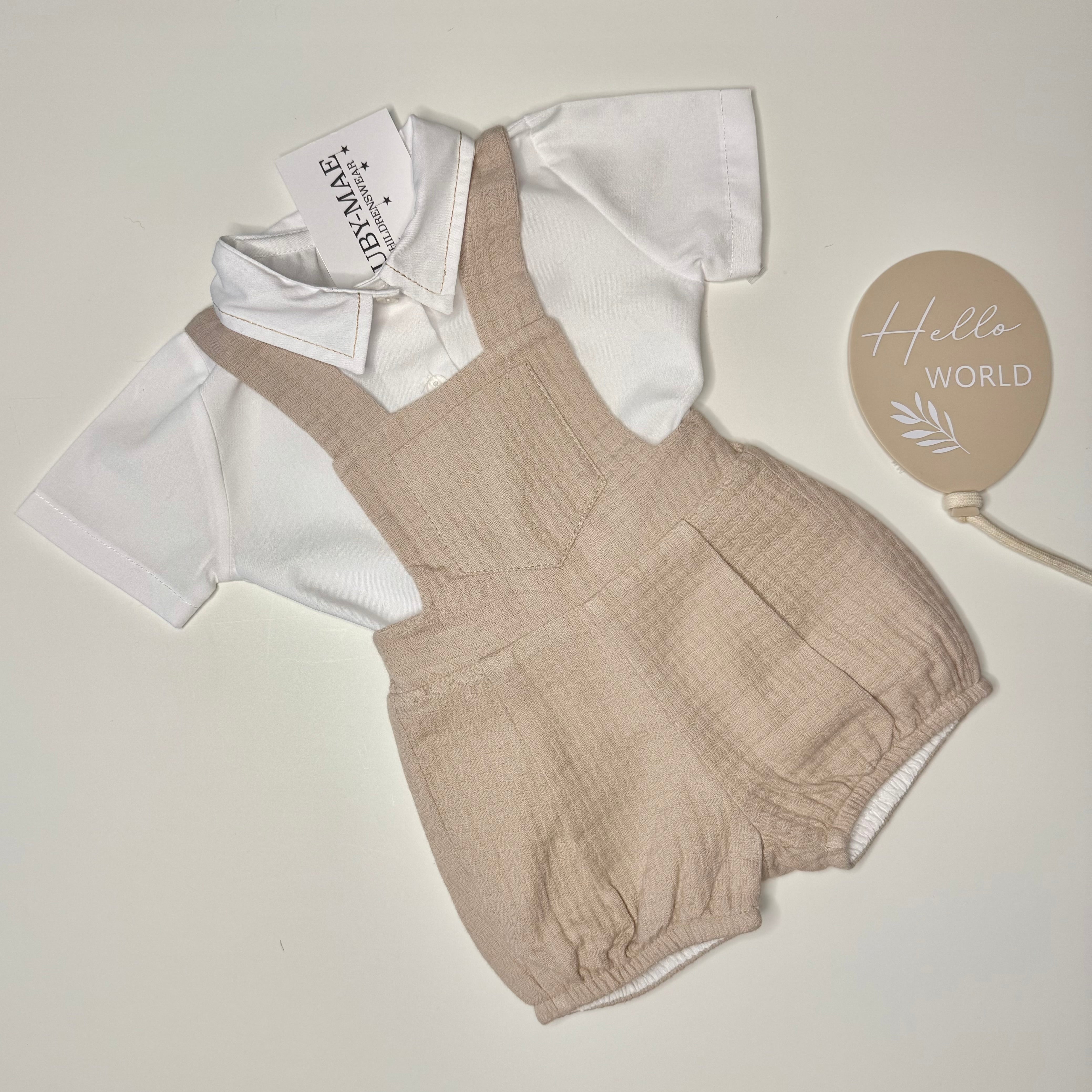 Camel Dungaree Shorts & Matching Long Sleeve White Shirt - Eddy