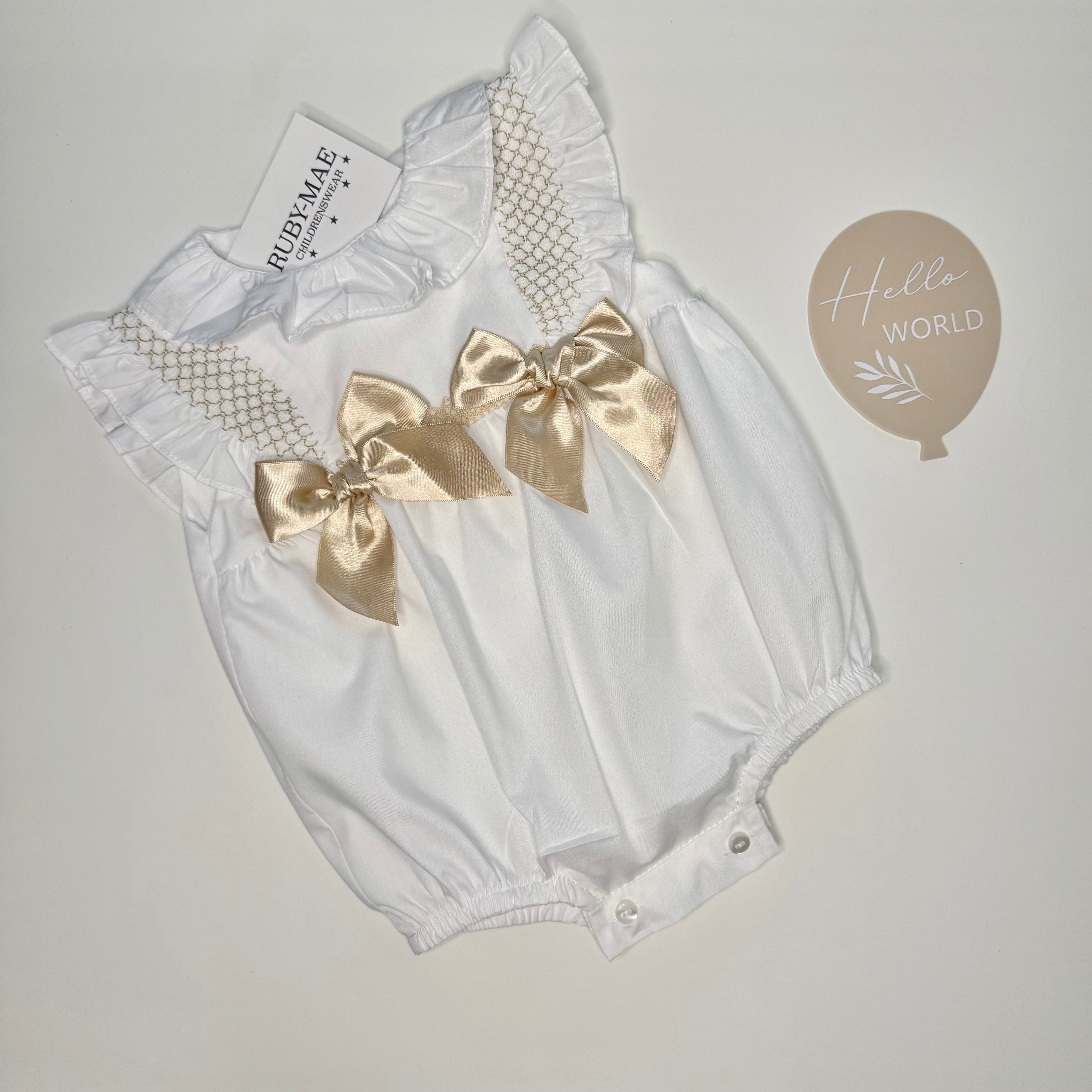 White With Beige Bow Smock Romper - Imogen