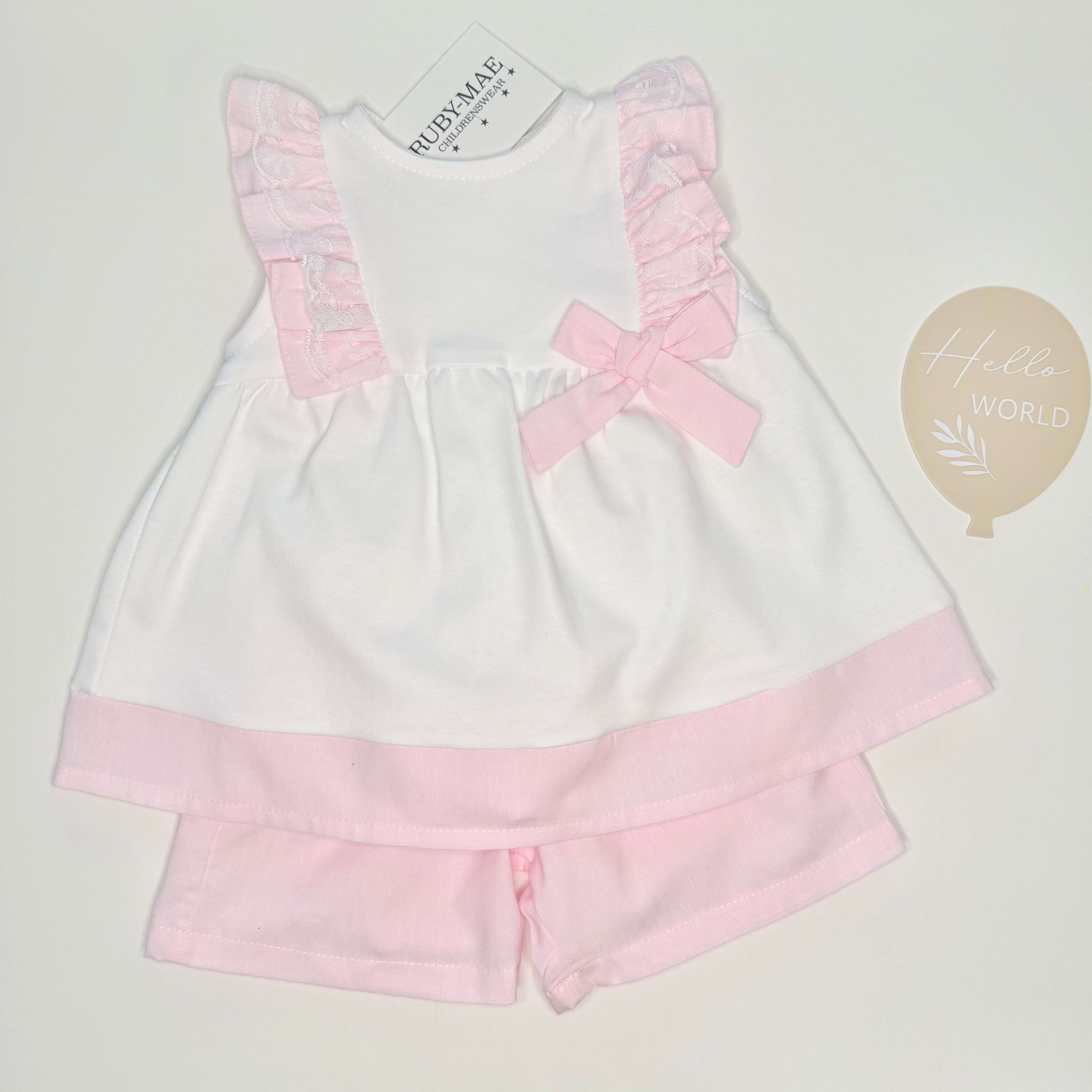 Pink & White Frill Bow Top With Matching Shorts Set - Freyah