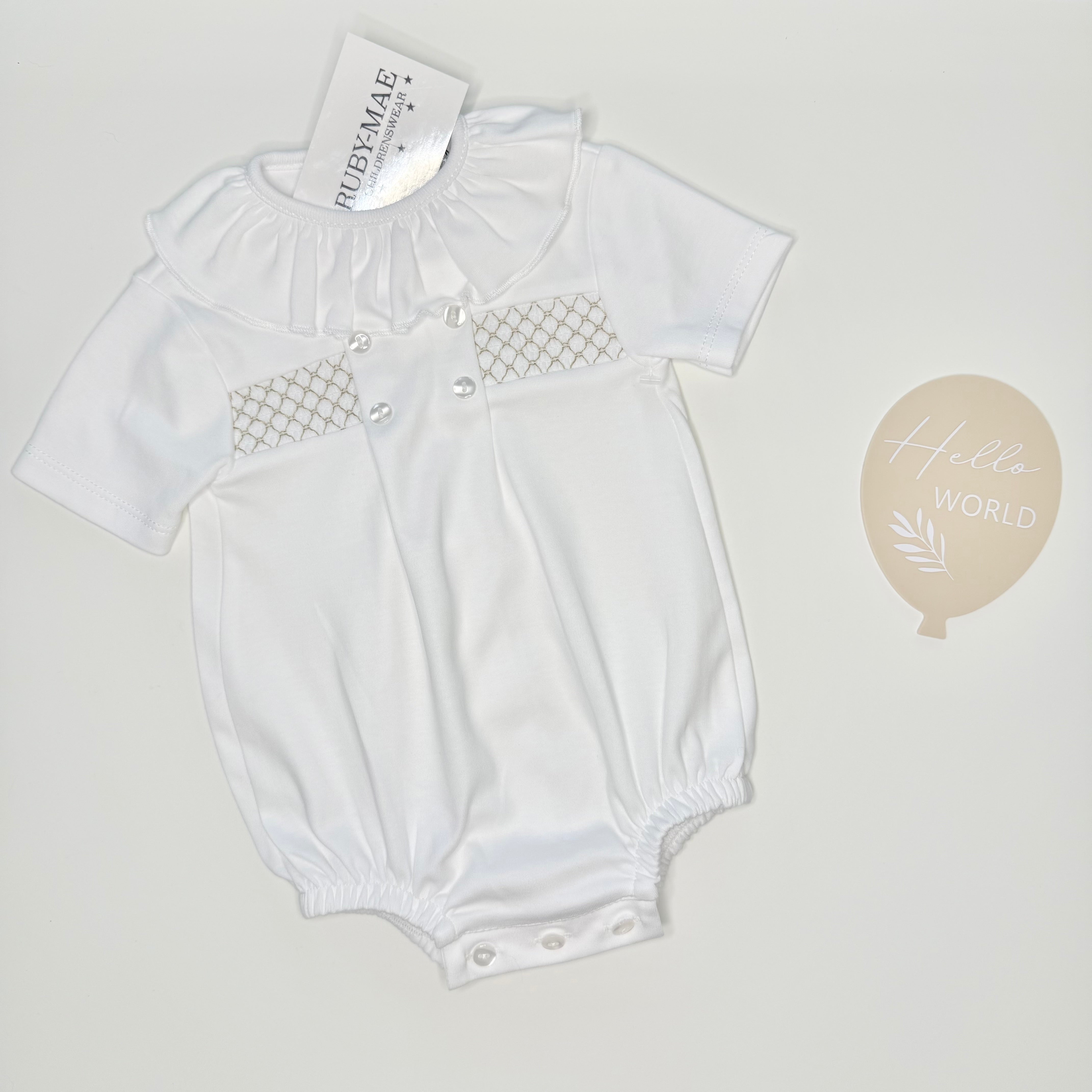 White With Beige Smock Frill Romper - Eliza